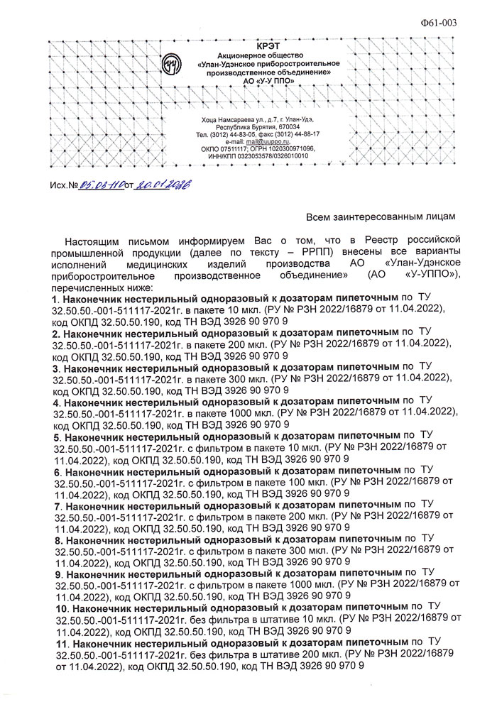 - Наконечники полимерные. У-У ППО. Выписки из РРПП-4
