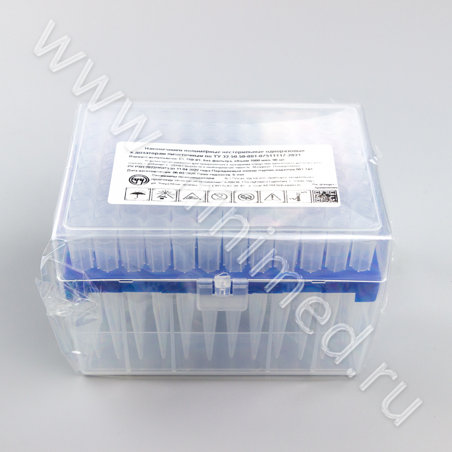 Наконечник полимерный нестерильный одноразовый к дозаторам пипеточным по ТУ 32 50 50-001-07511117-2021 без фильтра 1000 мкл, уп.штатив 96 шт, У-У ППО