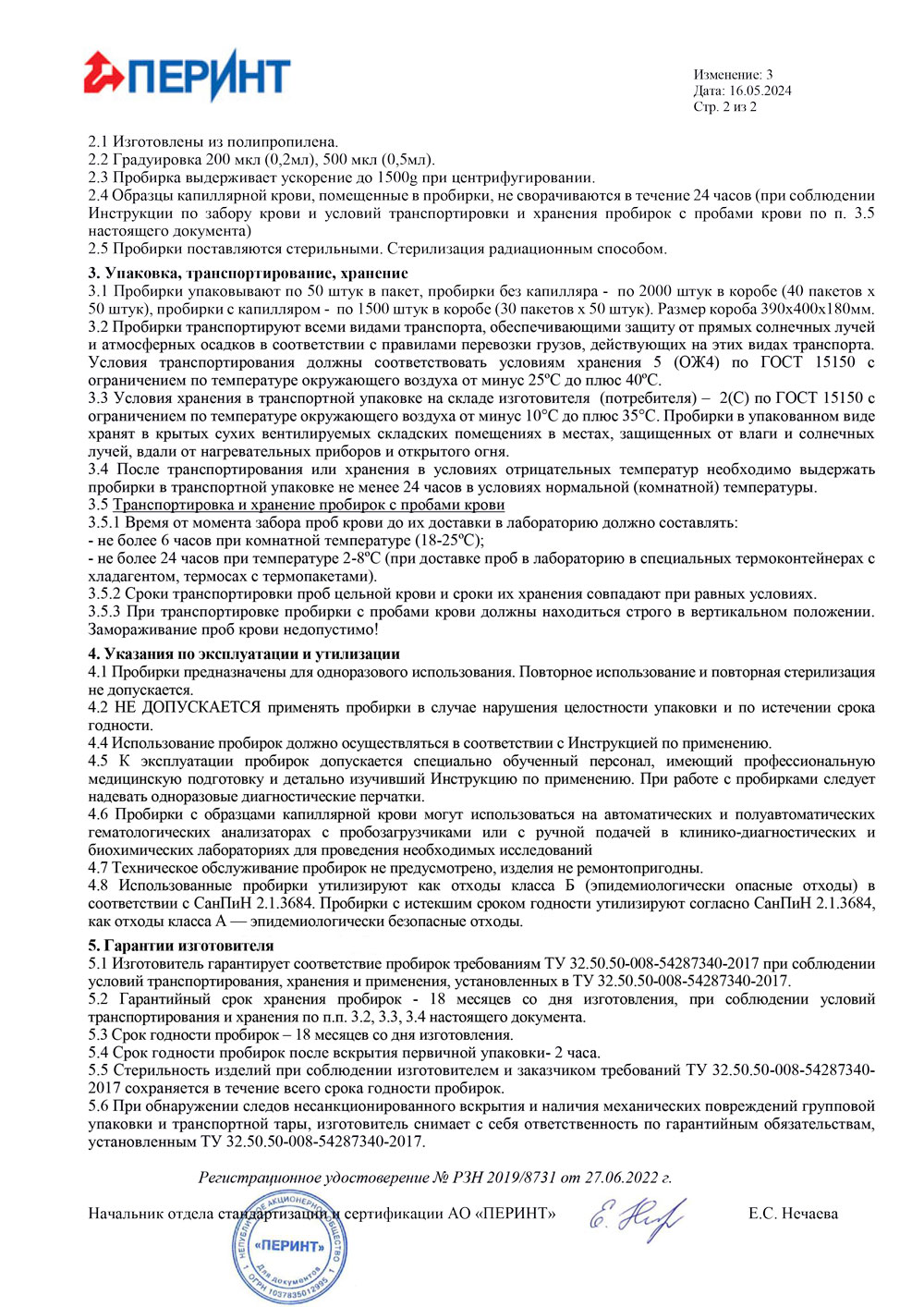 - Пробирки не вакуумные для взятия капиллярной крови однор. Перинт. Тех. паспорт-2