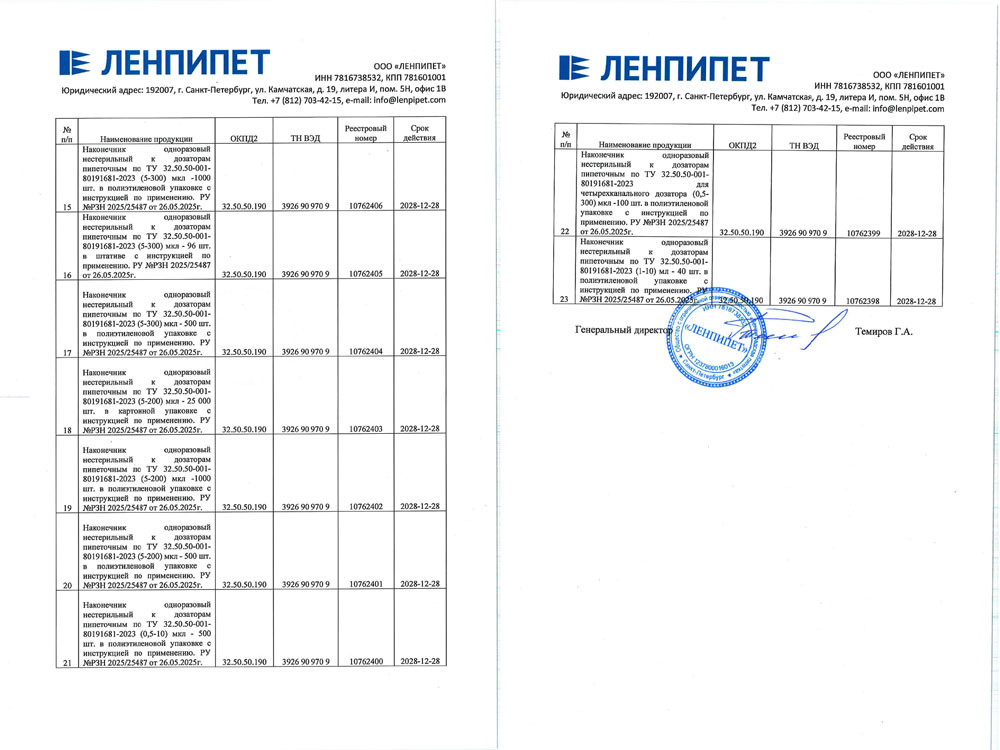 - Наконечники нестерильные. Ленпипет. Сертификат до 19.11.2027