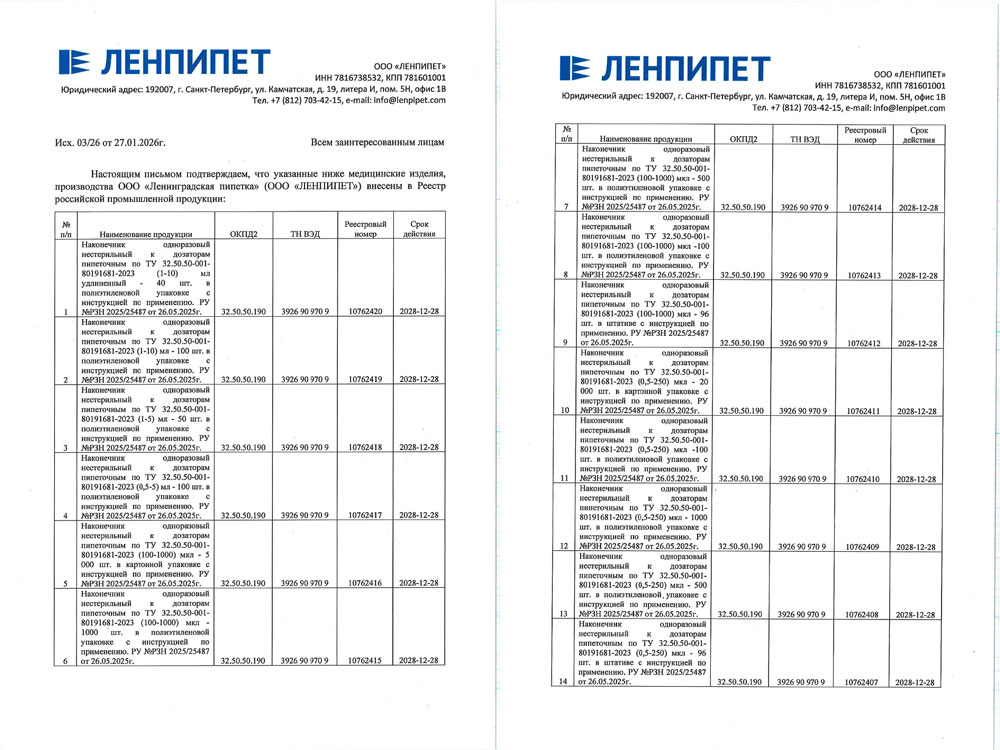 - Наконечники нестерильные. Ленпипет. Выписки из РРПП-1