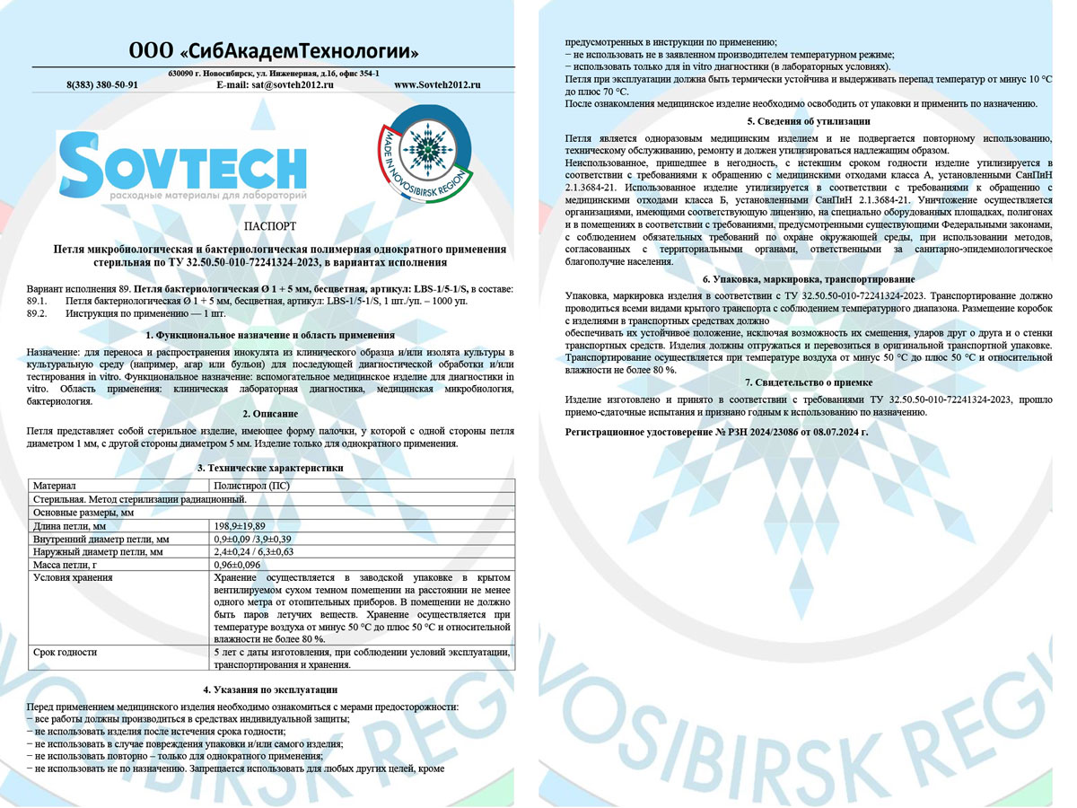 - Петля бектериол. 1+5 мм с иглой (инд. уп.). СибАкадемТехнологии. Тех. данные