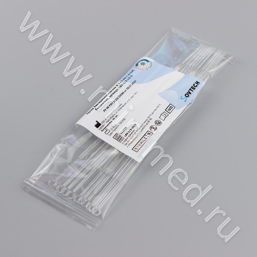 Петля бактериологическая применяется для перевивки жидких культур микроорганизмов, засева чашек Петри, косого агара, счета колоний, снятия колоний с питательной среды и взятия биологического материала для бактериологических исследований. Петля представляет собой палочку с петлей 1 мкл на одном конце и с петлей 10 мкл на противоположном конце. Изделие изготовлено из гибкого полистирола для удобного, равномерного и гладкого нанесения штрихов без повреждения поверхности агара. Так же при необходимости, головки полистироловых петель легко отламываются, благодаря чему головку петли со взятым материалом возможно помещать в малую емкость с жидкой средой для транспортировки. Гладкое, закругленное окончание петли не повреждает агар. Ручка изделия имеет ребристое основание для предотвращения скольжения в руке и удобства в работе. Петли являются стерильными одноразовыми, они не требуют прокаливания, что уменьшаем риск аэрозольного разбрызгивания инфекционного материала в лабораториях.