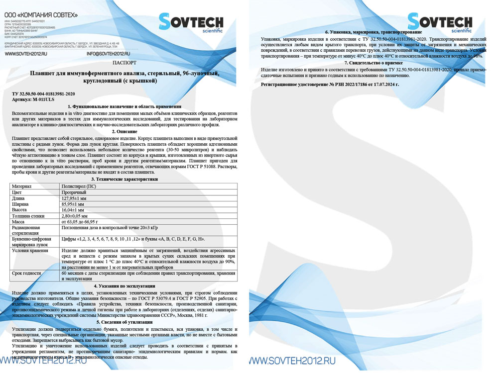 Планшет для иммуноферментного анализа, стерильный, 96-луночный, круглодонный (с крышкой), инд.уп.