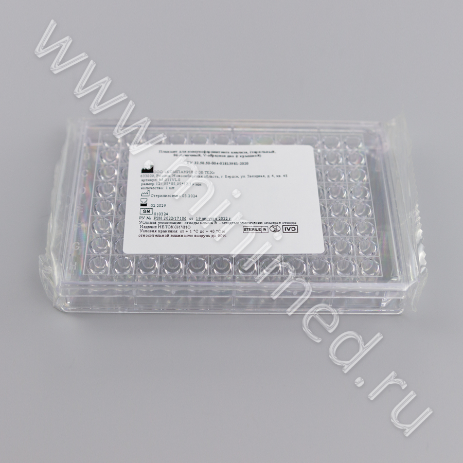 Планшет для иммуноферментного анализа, стерильный, 96-луночный, V-образное дно (с крышкой), инд.уп