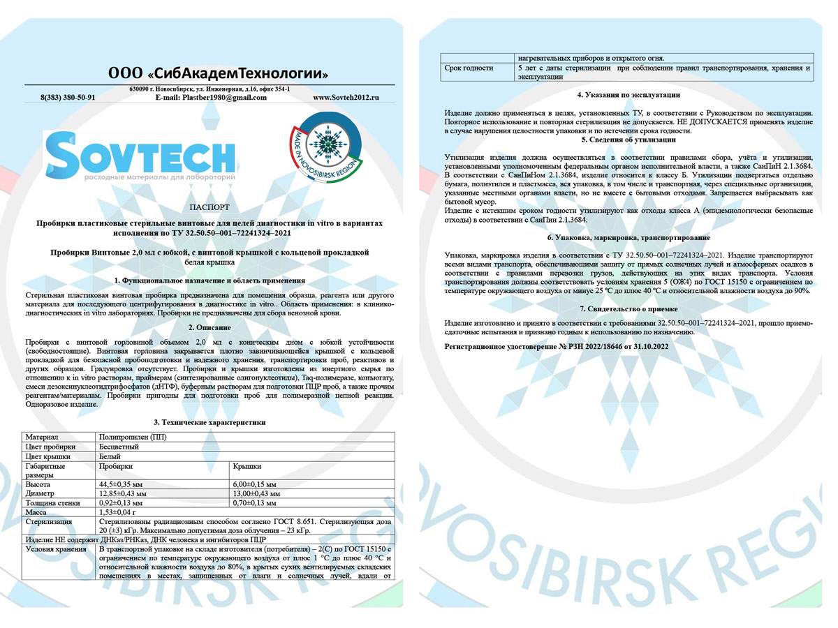 Пробирка винтовая 2 мл с навинченной крышкой и уплотнительным кольцом для герметичности используются для лабораторных исследований, хранения in-vitro и транспортировки проб и образцов. Пробирки и крышки с кольцевой прокладкой изготовлены из полимерного химически устойчивого материала с низкой адгезией. Пробирки имеют юбку устойчивости. Так же имеют боковые ребра, которые позволяют отвинчивать крышку одной рукой. Адаптированы для автоматических разливочных станций и большинства центрифуг. Центрифугируются при 20 000 g. Автоклавируются при 121 °C, 15 минут. Замораживаются до – 90 °C, Без градуировки.