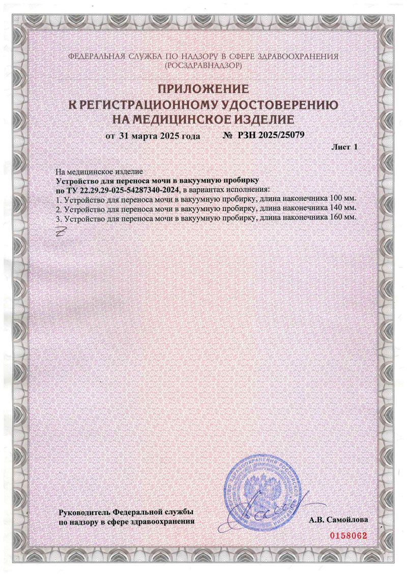 Устройство для переноса мочи в вакуумную пробирку предназначено для переноса мочи пациента в вакуумную пробирку с целью последующего проведения различных видов лабораторных исследований, в качестве вспомогательного средства для диагностики in vitro. Изделие нестерильное, одноразового использования.