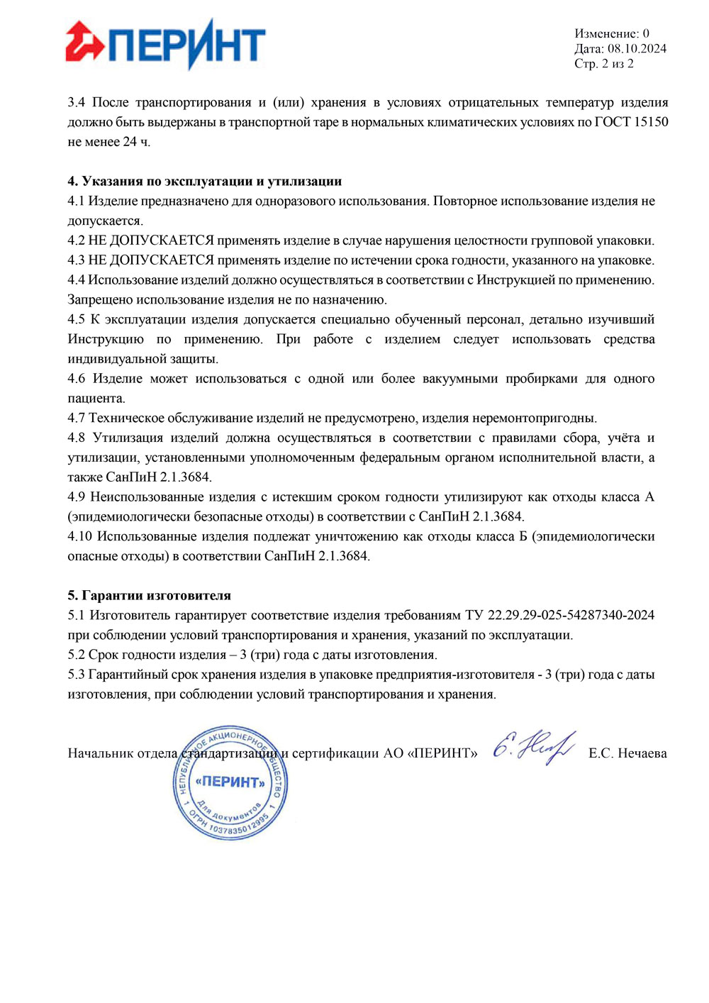- Устройство для переноса мочи в вакуумную пробирку. Перинт. Тех. данные-2