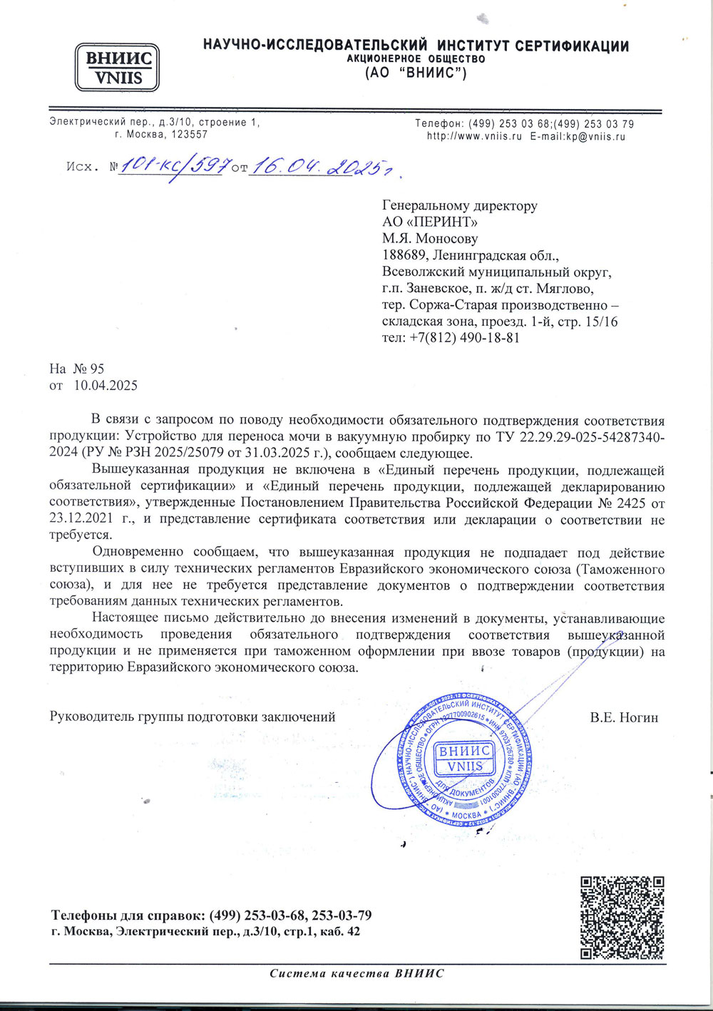 - Устройство для переноса мочи в вакуумную пробирку. Перинт. Отказное письмо