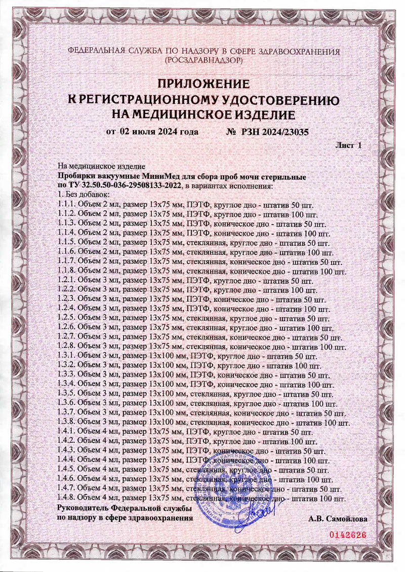 - Пробирки вакуумные МиниМед для сбора проб мочи стерильные. РУ-4