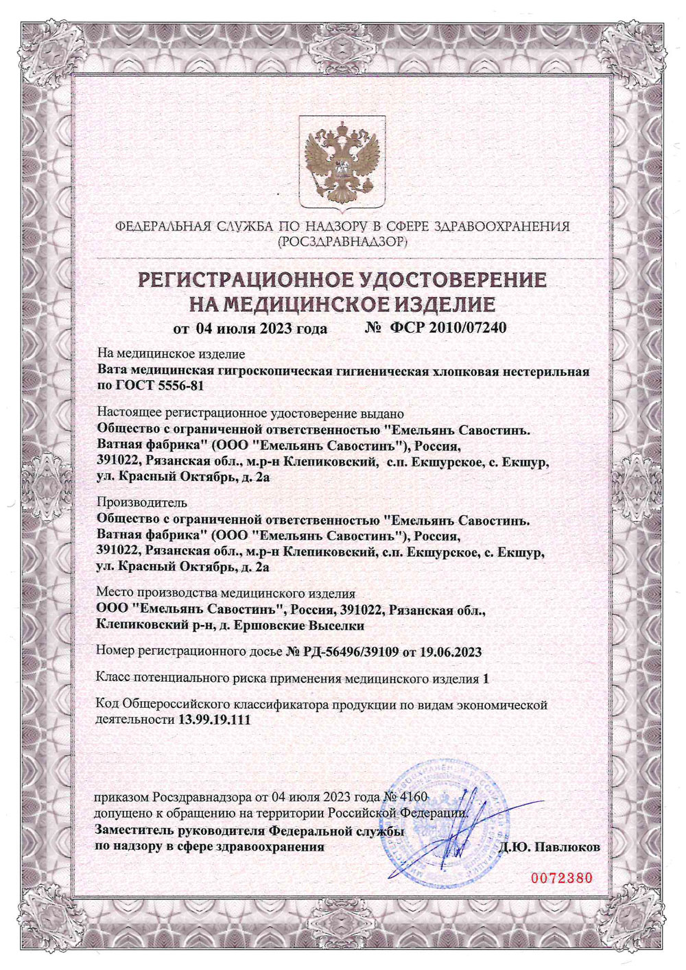 РУ № ФСР 2010/07240 от 04.07.2023 г.