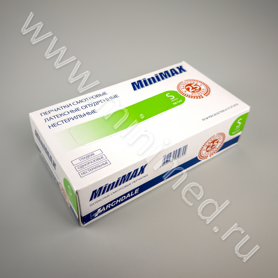 Перчатки смотровые латексные опудренные гладкие нестерильные MiniMax р. S, уп.50пар/кор.10уп