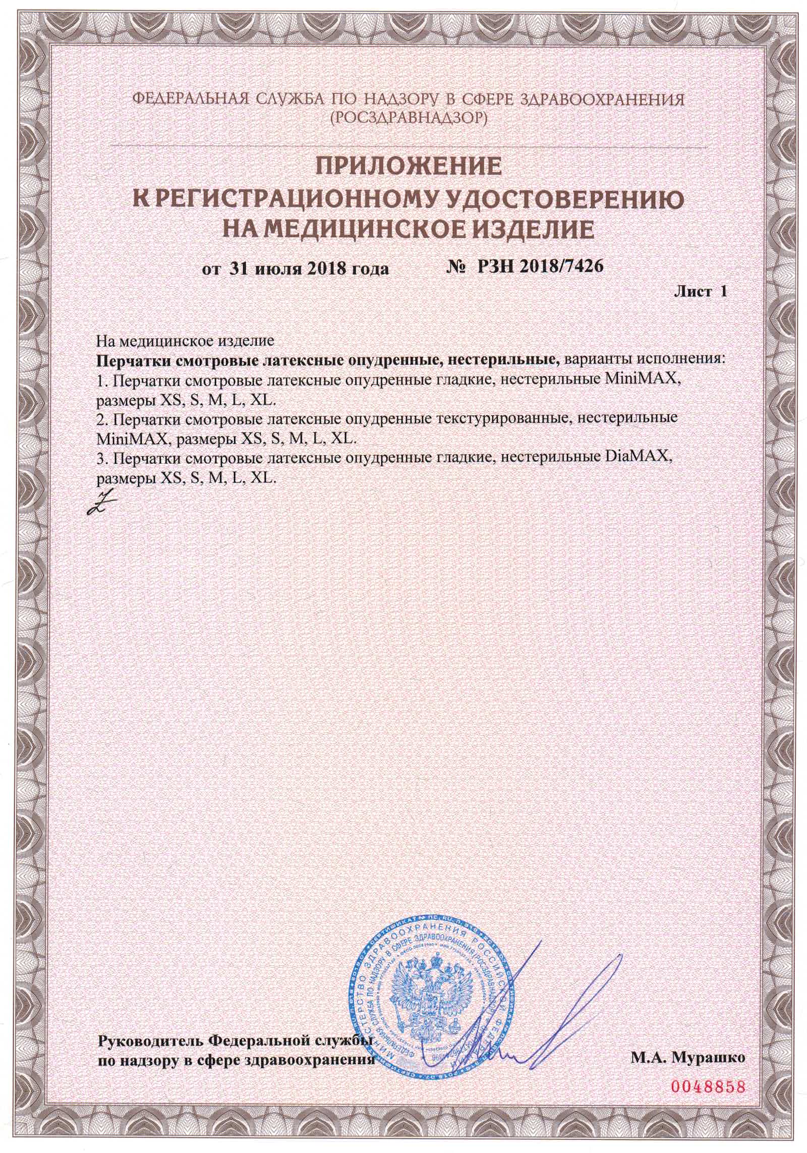 РУ № РЗН 2018/7426 от 31.07.2018г.