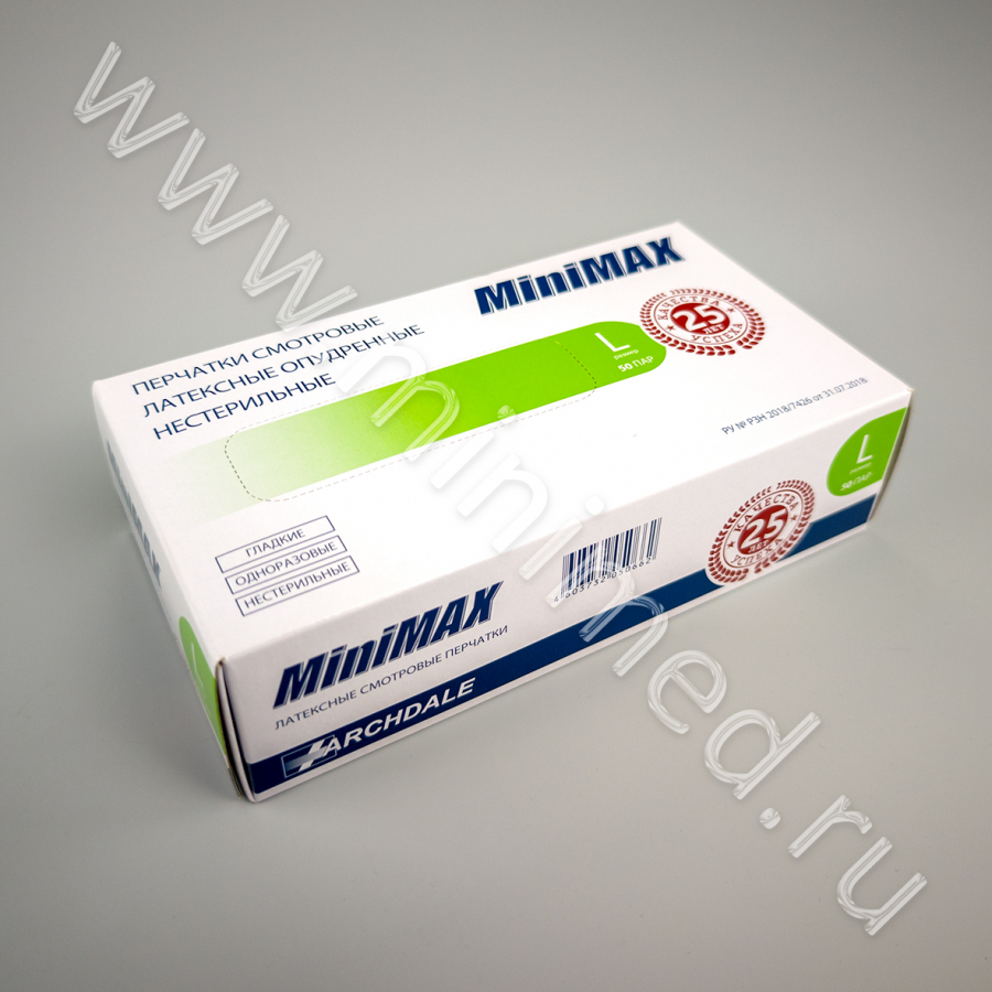 Перчатки смотровые латексные опудренные гладкие нестерильные MiniMax р. L, уп. 50 пар/кор.10уп