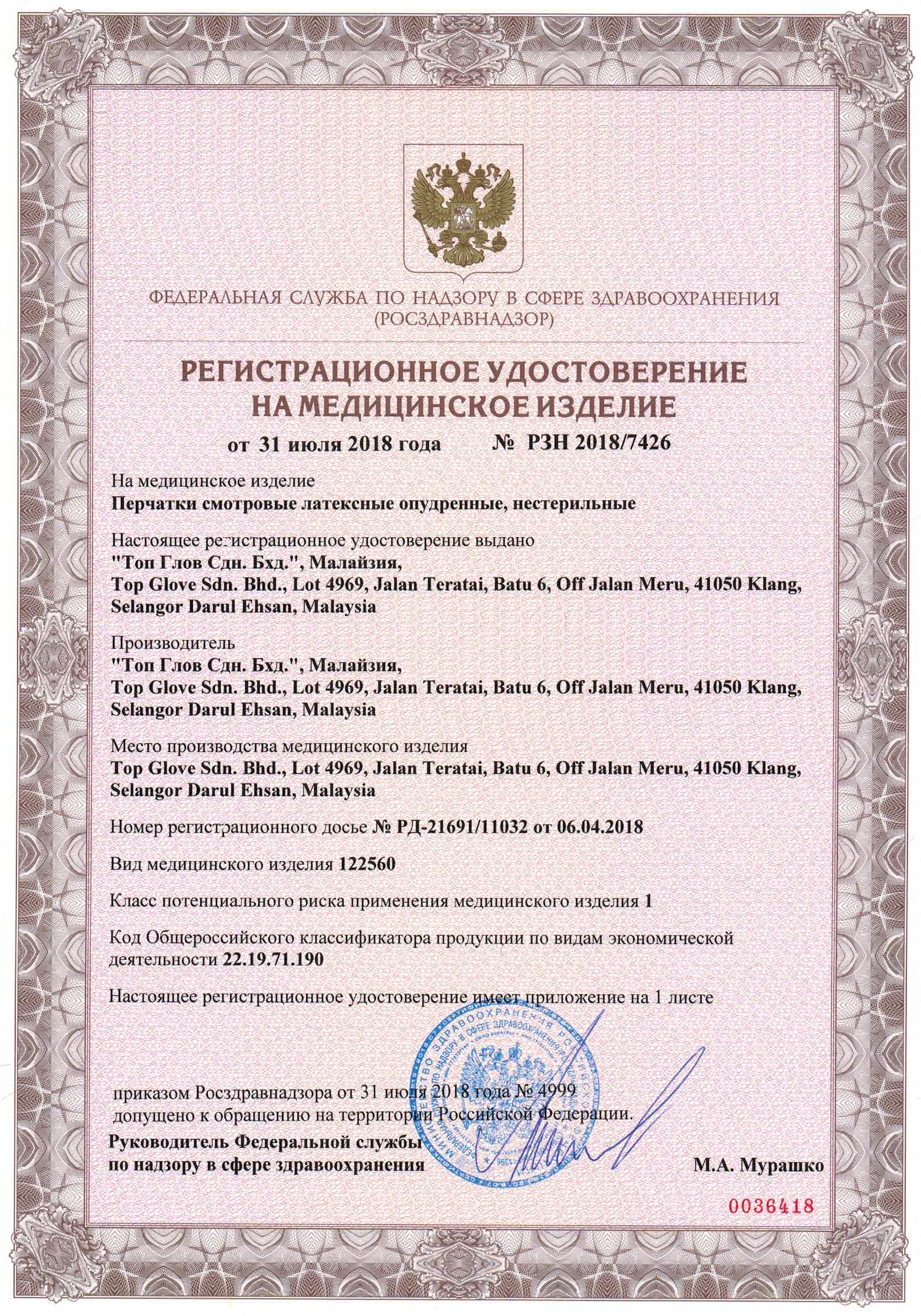 РУ № РЗН 2018/7426 от 31.07.2018г.