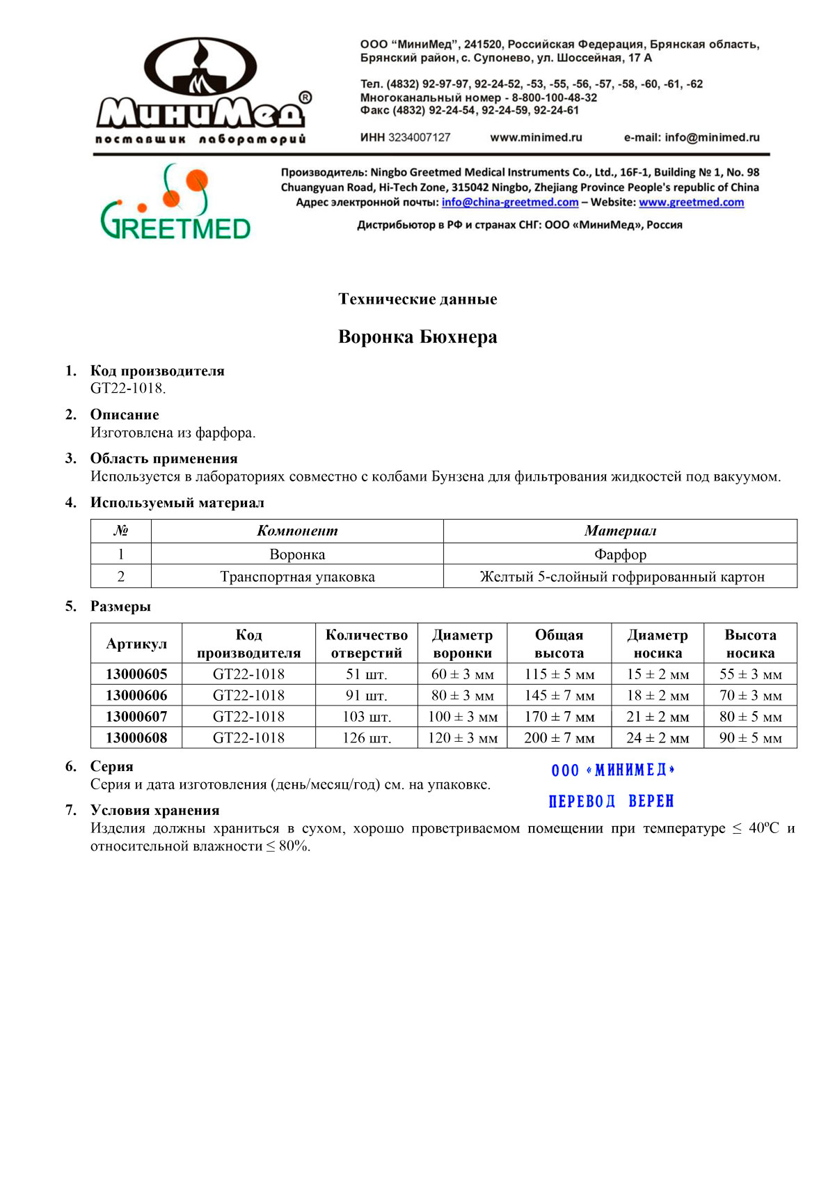 Воронка Бюхнера, D80, Н145, 91отв., уп.5 шт