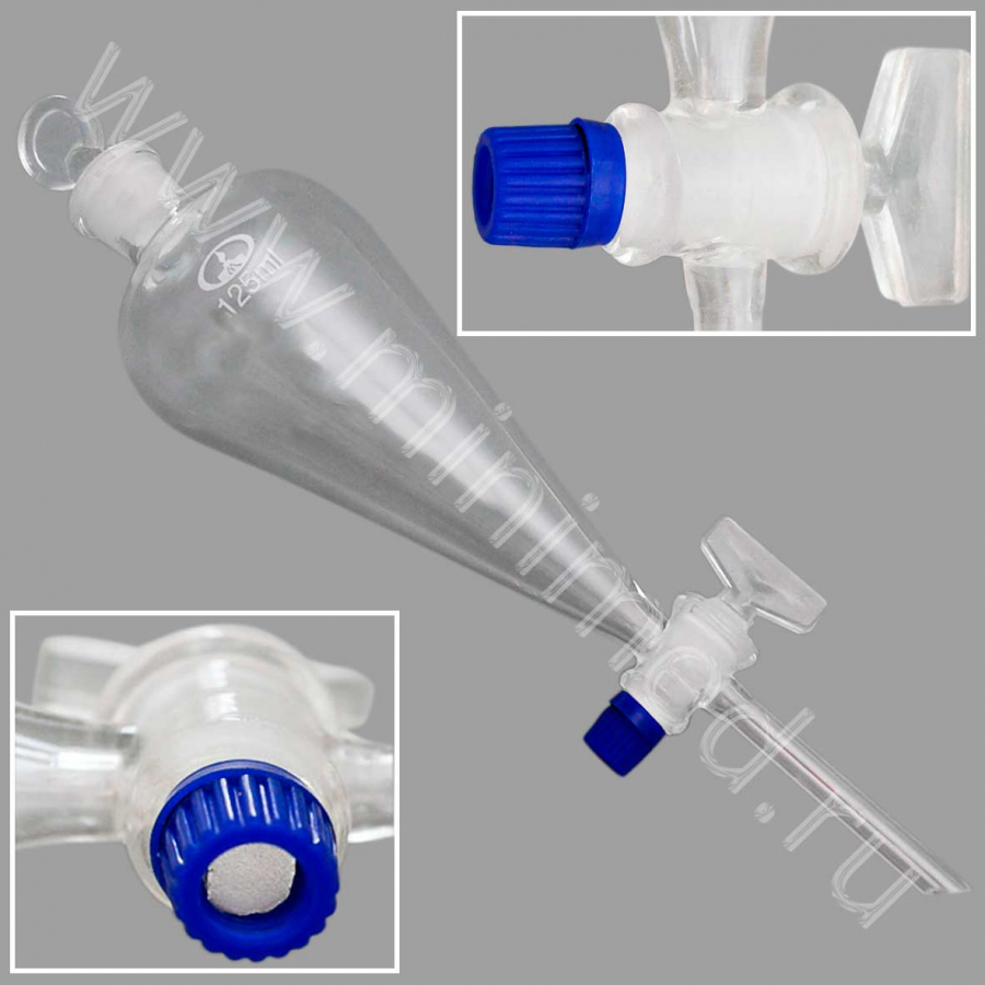 Предназначены для разделения несмешивающихся жидкостей в процедурах экстрагирования. Изделия изготовлены из химико-лабораторного стекла. Материал гайки АБС-пластик.