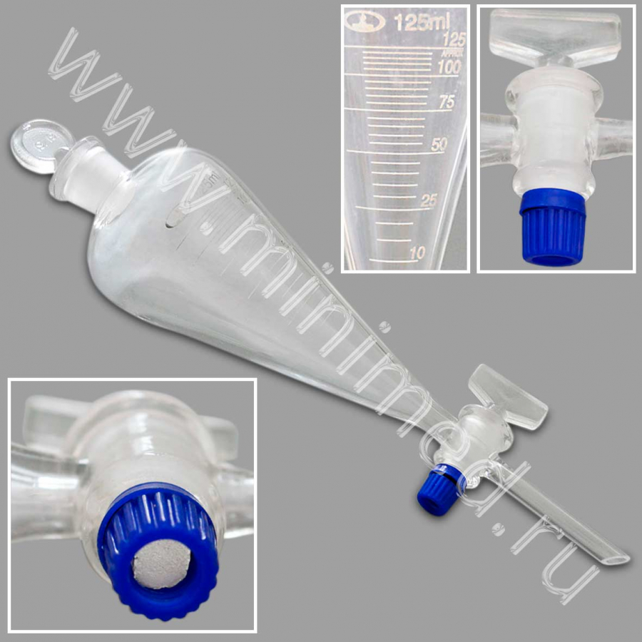 Предназначены для разделения несмешивающихся жидкостей в процедурах экстрагирования. Изделия изготовлены из химико-лабораторного стекла. Материал гайки АБС-пластик.