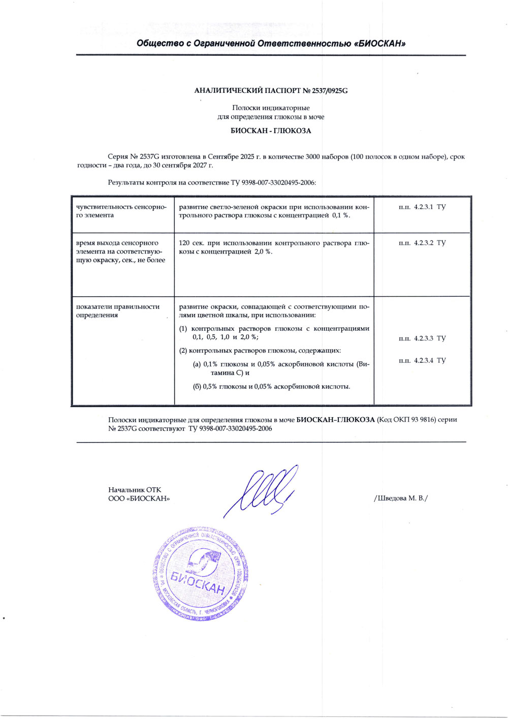 - Полоски индикаторные БИОСКАН-ГЛЮКОЗА, с. № 2537G от 09.2025
