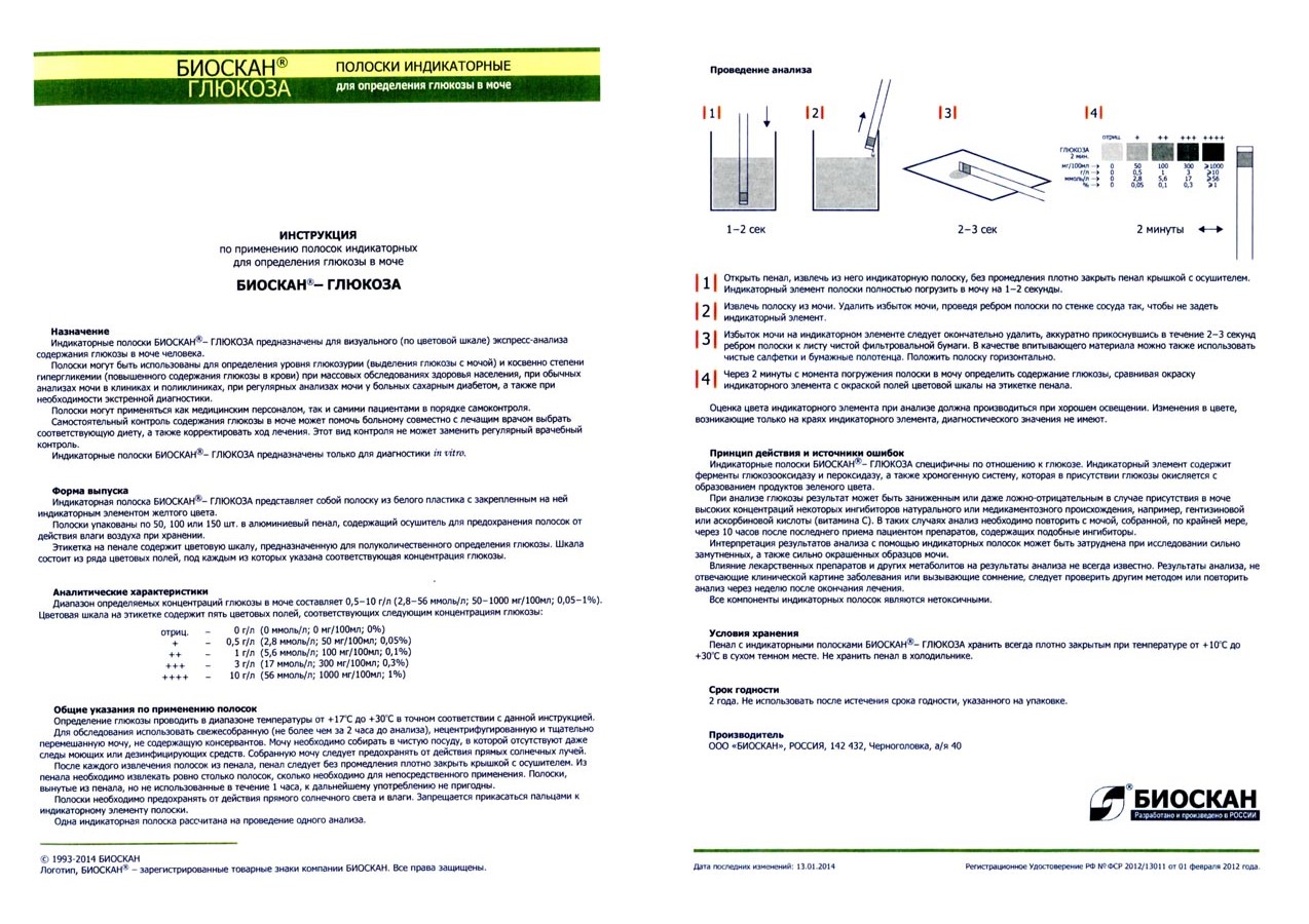 Полоски предназначены для экспресс-анализа содержания глюкозы в моче человека. Полоски специфичны по отношению к глюкозе. Индикаторный элемент содержит ферменты глюкозооксидазу и пероксидазу, а также хромогенную систему, которая в присутствии глюкозы окисляется с образованием продуктов зеленого цвета. Полоски могут быть использованы при массовых обследованиях здоровья населения, при обычных анализах мочи в клиниках и поликлиниках. Полоски могут применяться как медицинским персоналом, так и самими пациентами в порядке самоконтроля.