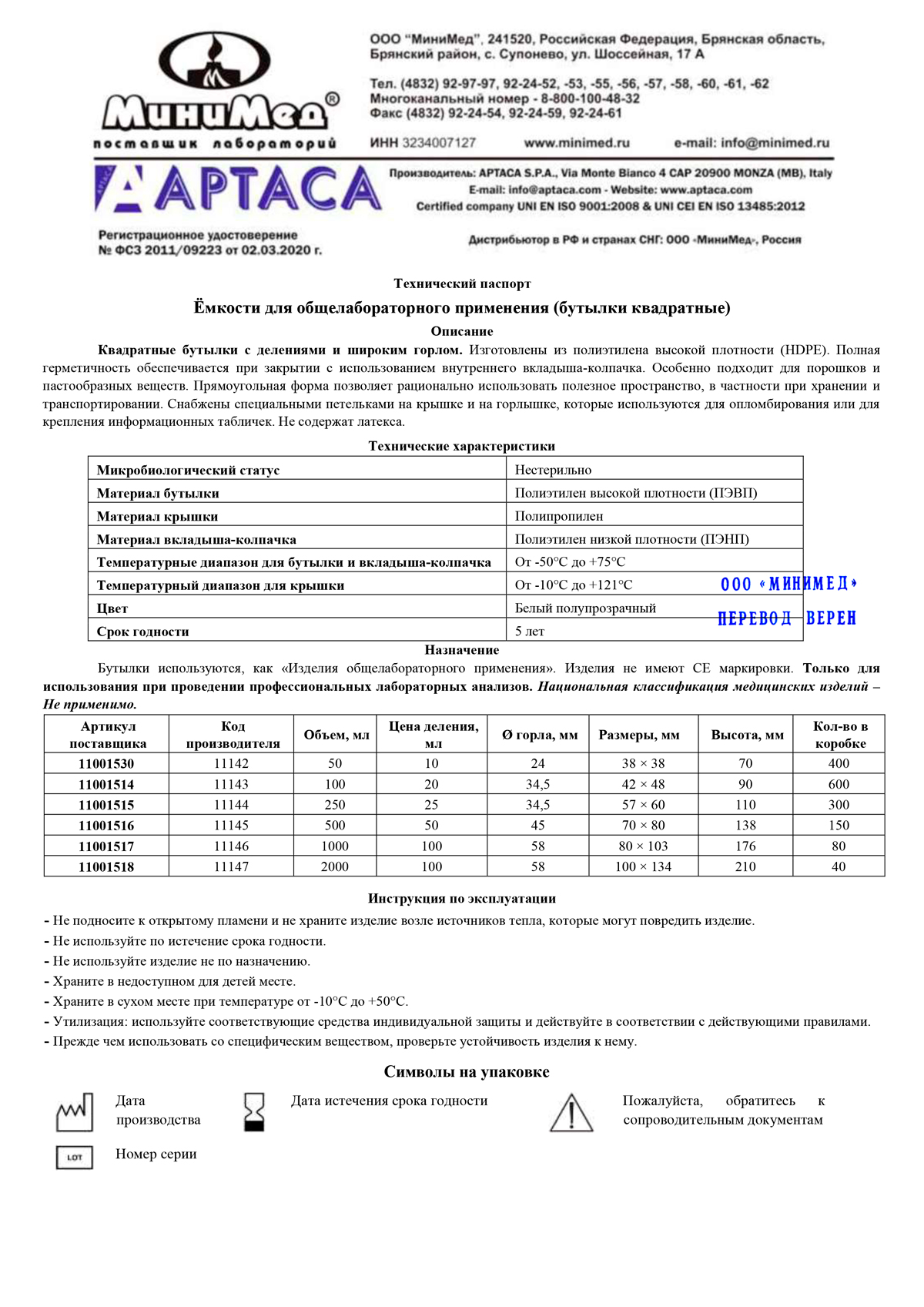 Емкость для общелабораторного применения (бутылка квадратная) 100 мл., с дел., ПЭВП, уп.10/600 шт, Aptaca