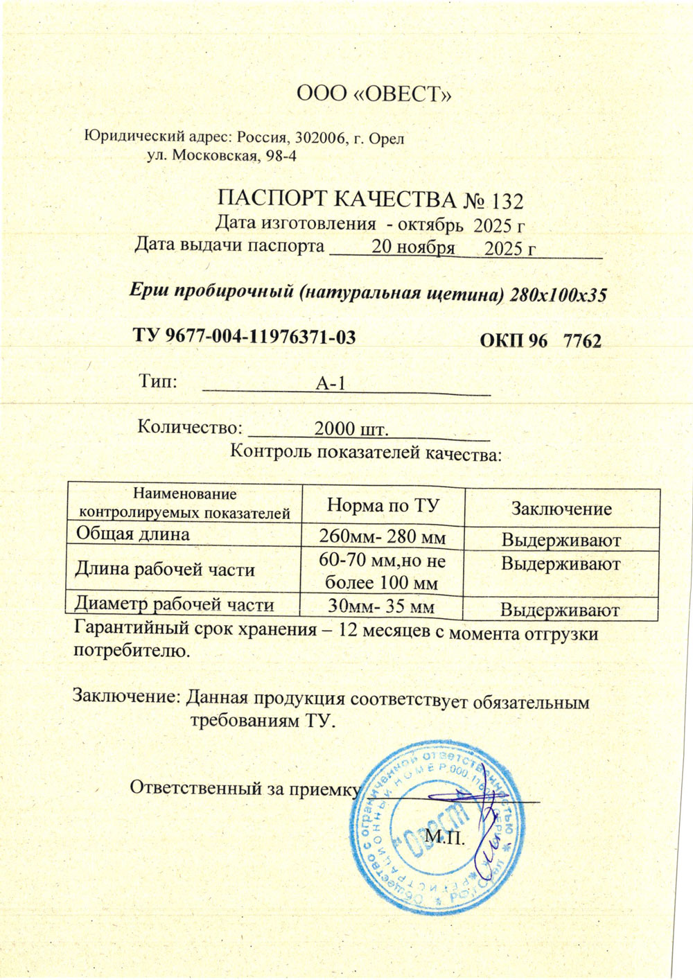 - Инф. письмо от Овест. Используемое сырьё для производства ершей.
