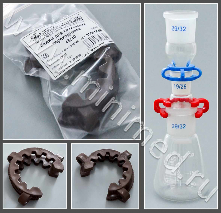 Предназначен для фиксирования стеклянных конических переходников с различными конусами в лабораторных установках. Не царапает стекло. Выдерживает автоклавирование. Имеет различные цветовые исполнения.