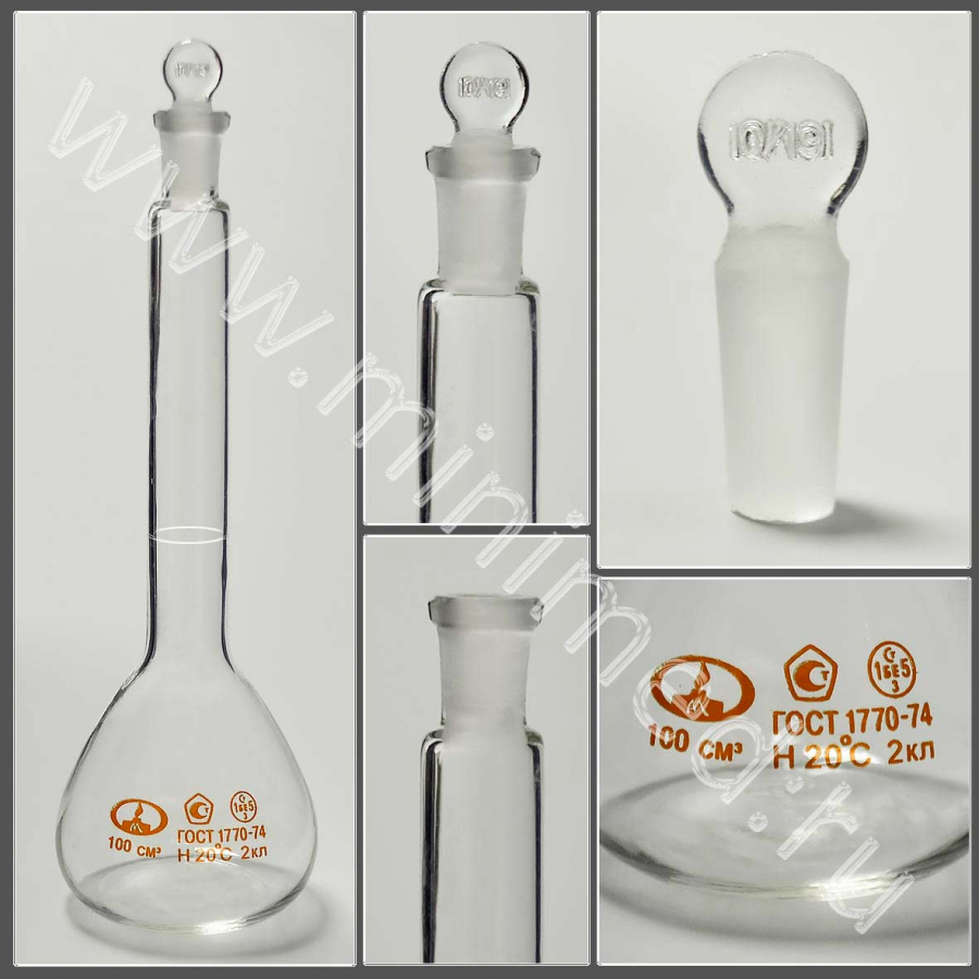 Колба 2-100-2 мерная, с пришлифованной пробкой 10/19, ТУ 9464-013-52876351-2014, ГОСТ 1770-74, МиниМедПром, уп.6 / кор.144 шт,