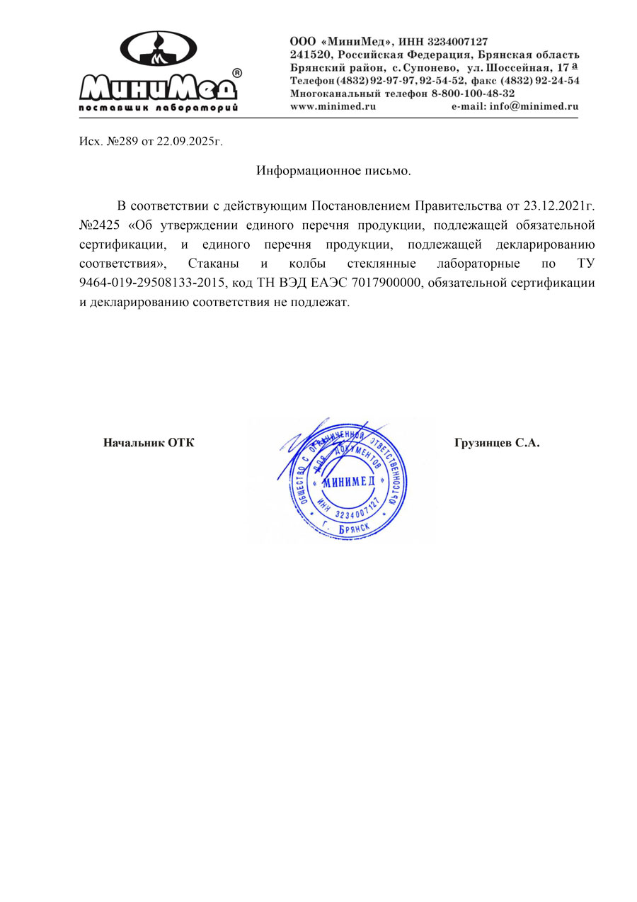 - Исх. № 289 Инфо Стаканы и колбы стеклянные МиниМед сертификация нов