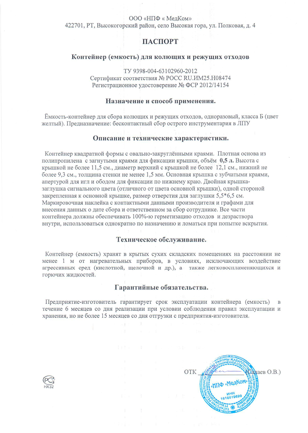 - Контейнеры для сбора, хранения и транспорт. мед. отходов МК-МедКом. Сертификат д
