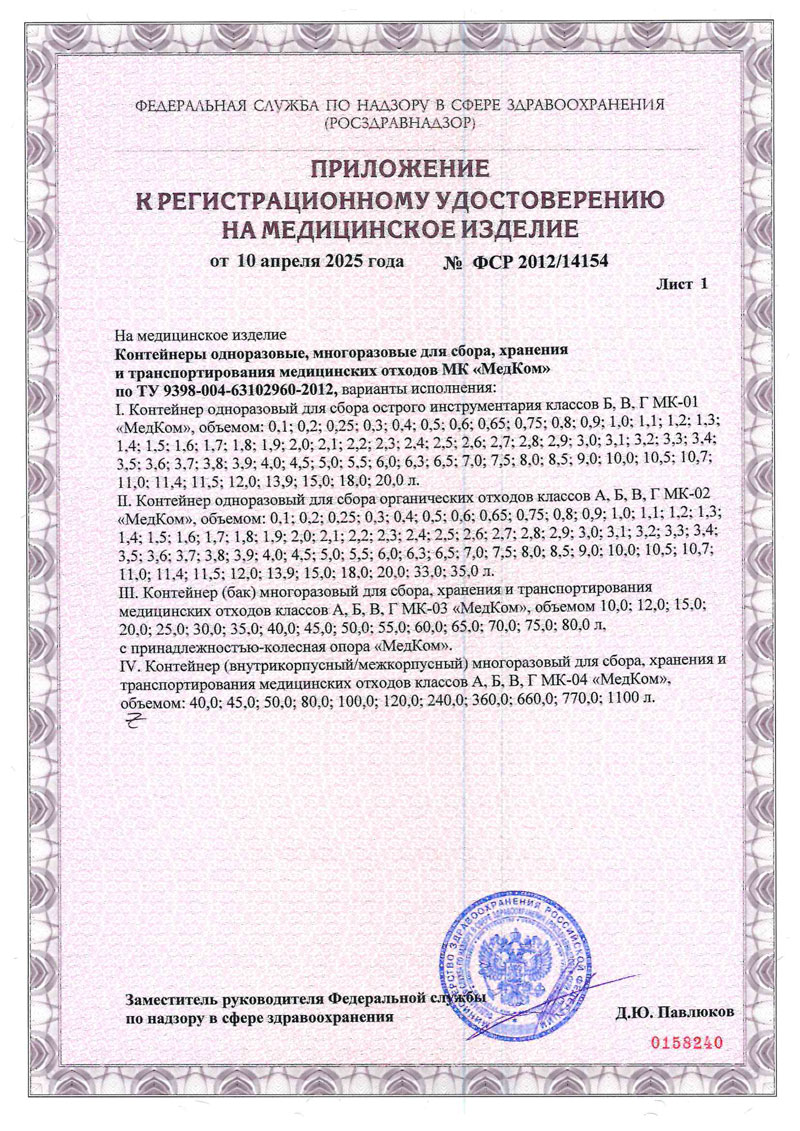 - Контейнеры для сбора, хранения и транспорт. мед. отходов МК-МедКом. РУ 2025-1