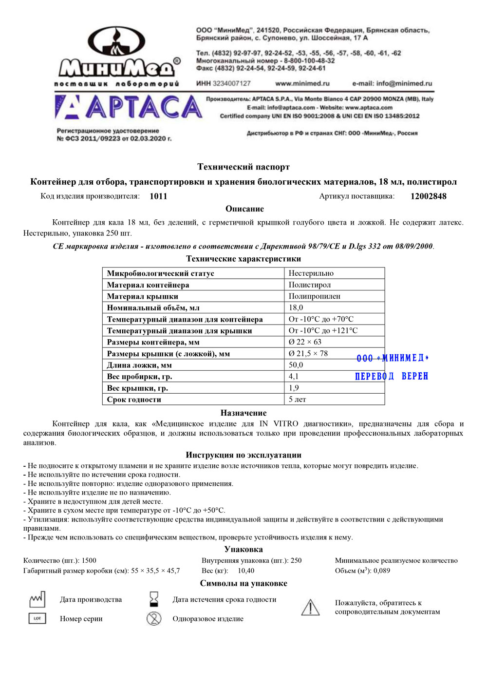 Контейнер д/отбора, транспортировки и хранения биологич. материалов, 18 мл с гермет. крышкой и ложкой.,Ø 22*63 мм, н/стер., п/с,Aptaca,