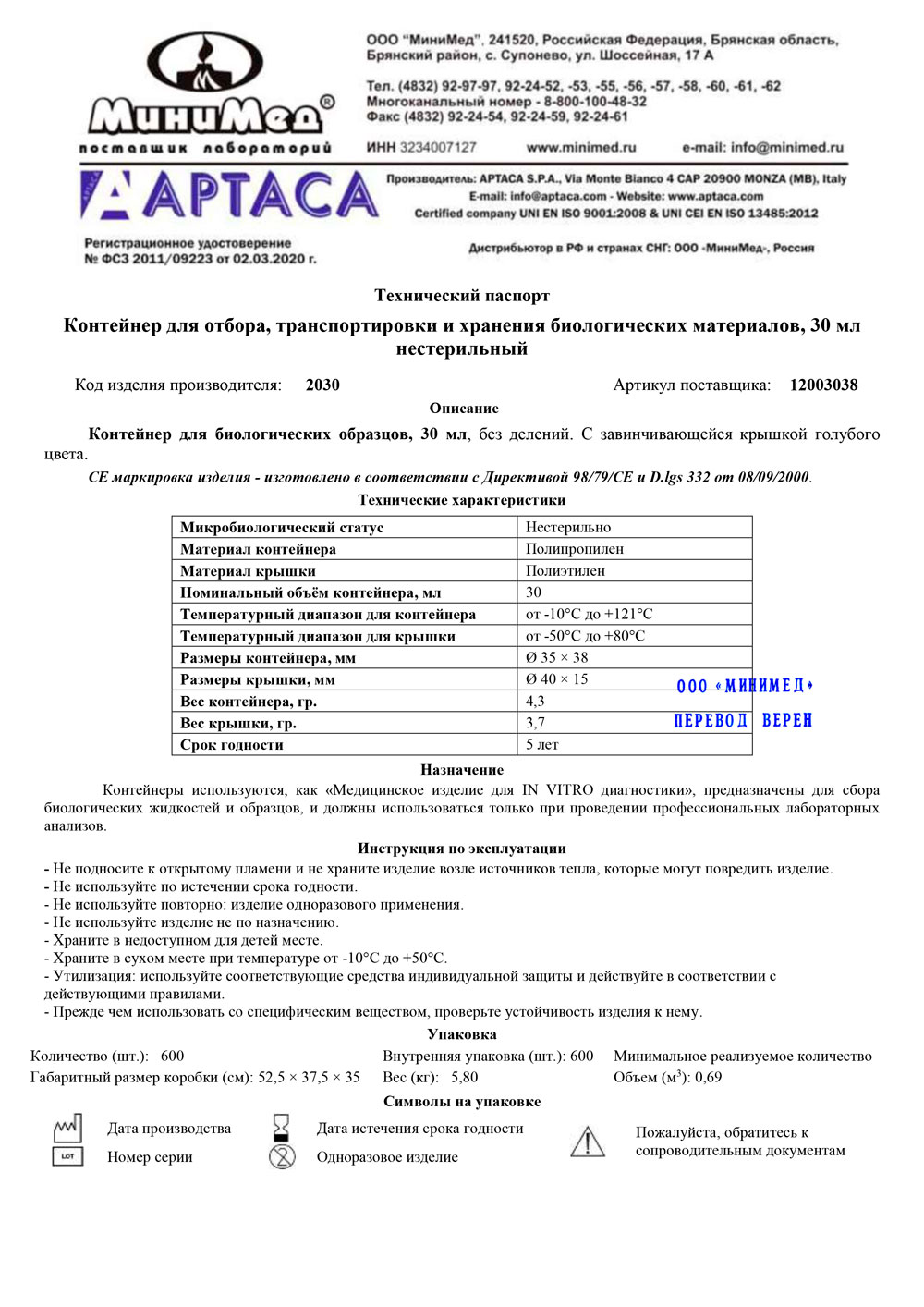Контейнер д/отбора, транспортировки и хранения биологич.материалов, 30 мл с завинч.крыш.,35*38 мм, нестер., п/п, уп.600шт, Aptaca