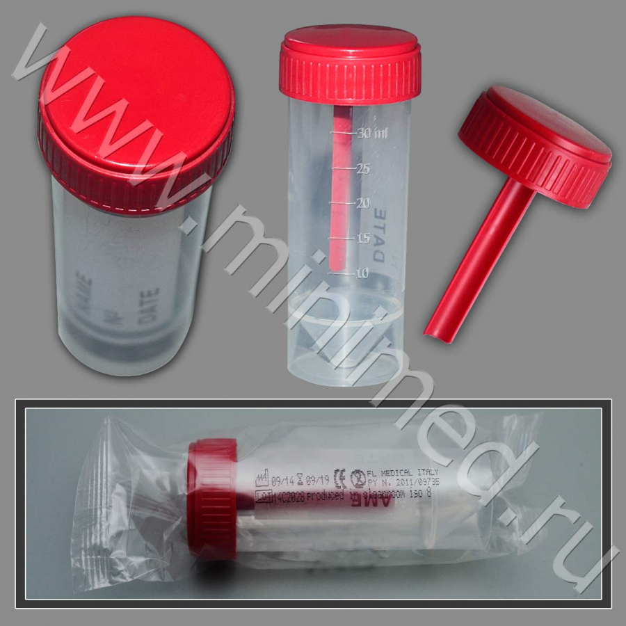 Контейнер с завинчивающейся крышкой и шпателем обеспечивает полную герметичность при транспортировке биологического материала. Изготовлен из ультрачистого полипропилена. Имеет градуировку и матовое окошко для записи. Нестерильный.