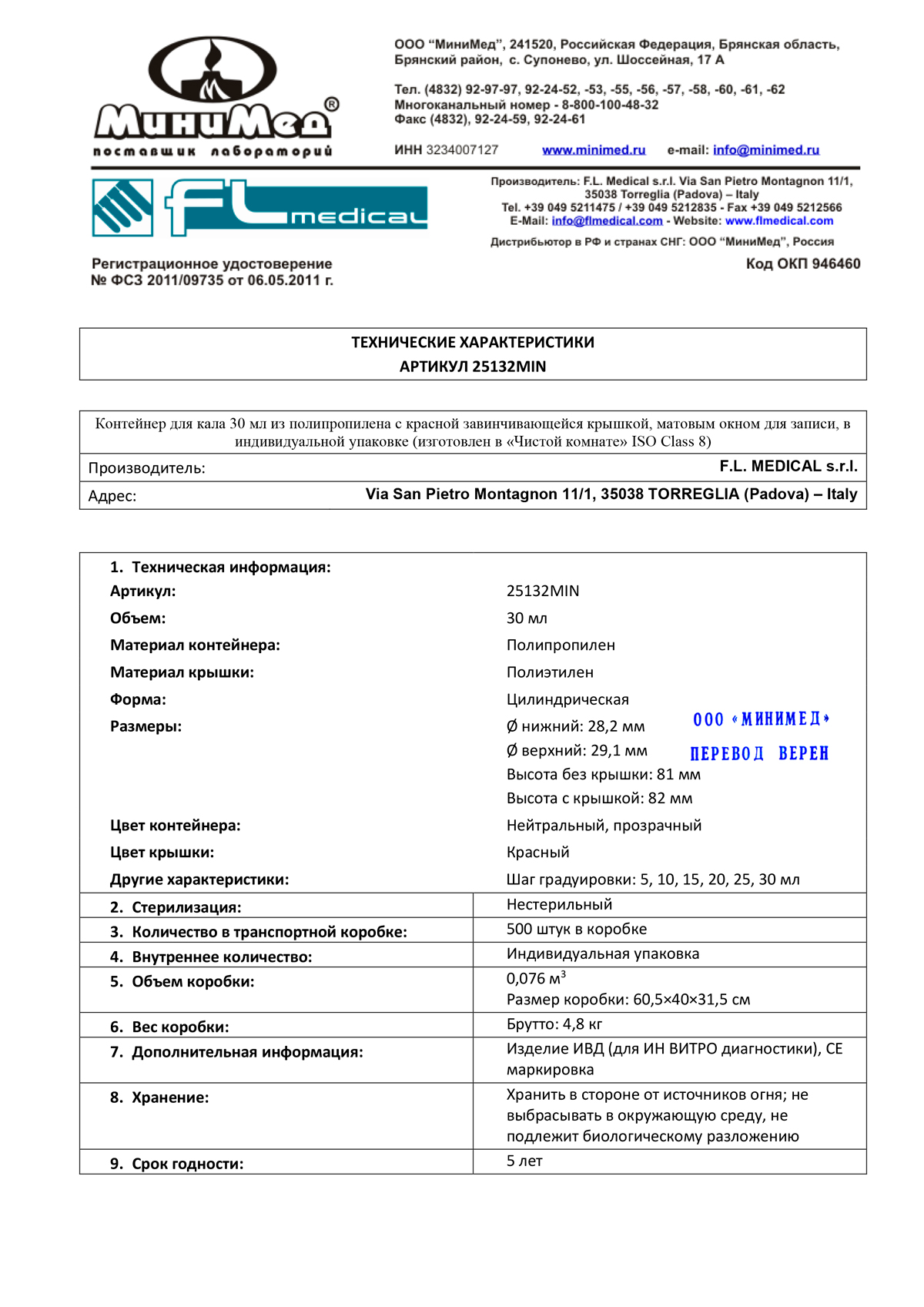 Контейнер лаб. д/взятия проб, 30 мл с завинч. крыш. и шпателем,н/стер.,инд.уп.,п/п,FL medical, кор.500 шт.