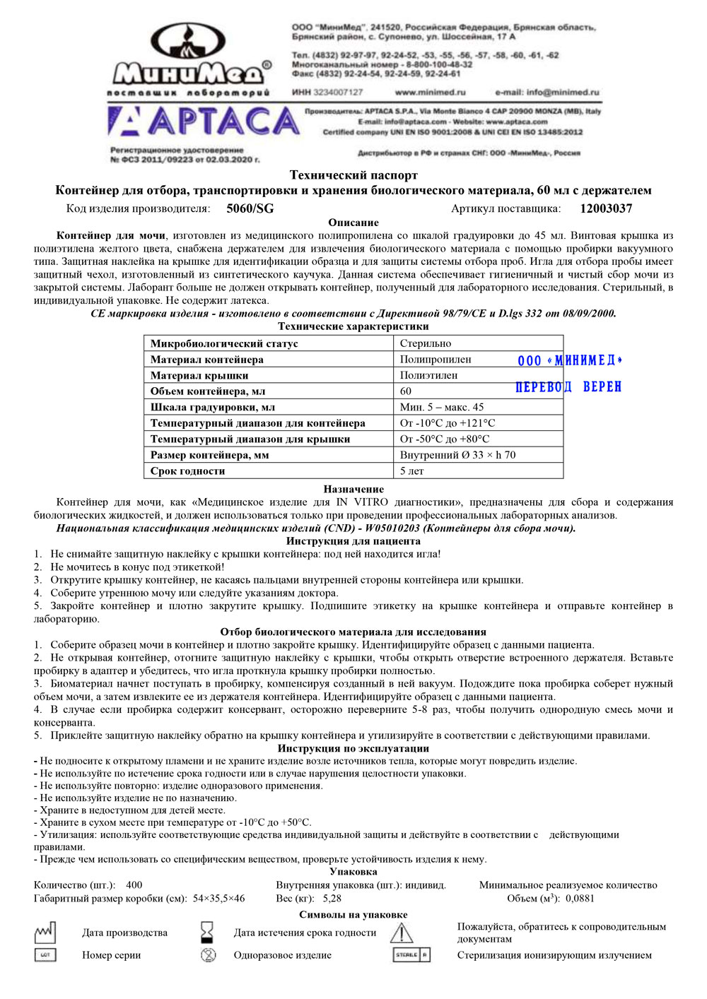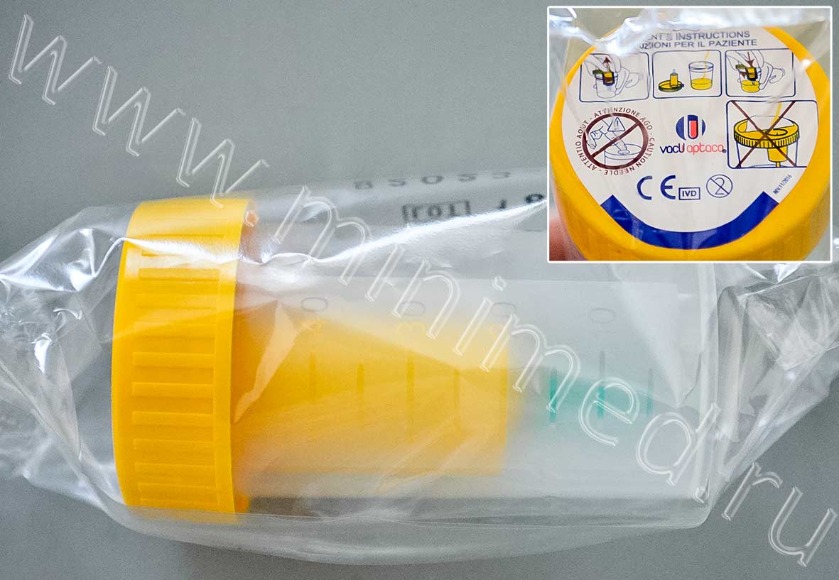 Обеспечивает полную герметичность при транспортировке биологического материала. Материал контейнера - полипропилен, крышки - полиэтилен. Винтовая крышка снабжена держателем для извлечения биоматериала с помощью пробирки вакуумного типа (арт. 12007052, 12007050), защитная наклейка на крышке для идентификации образца и для защиты системы отбора пробы. Игла для отбора пробы имеет защитный чехол, изготовленный из синтетического каучука. Данная система обеспечивает гигиенический сбор мочи. Имеет градуировку и матовое окошко для записи. Стерильный.