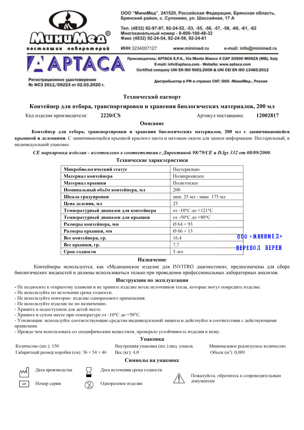 Контейнер д/отбора, транспортировки и хранения биологич. материалов, 200 мл с завинч. крыш., с дел.,диам.64*93 мм, н/стер., п/п, инд. уп./150шт, Aptaca
