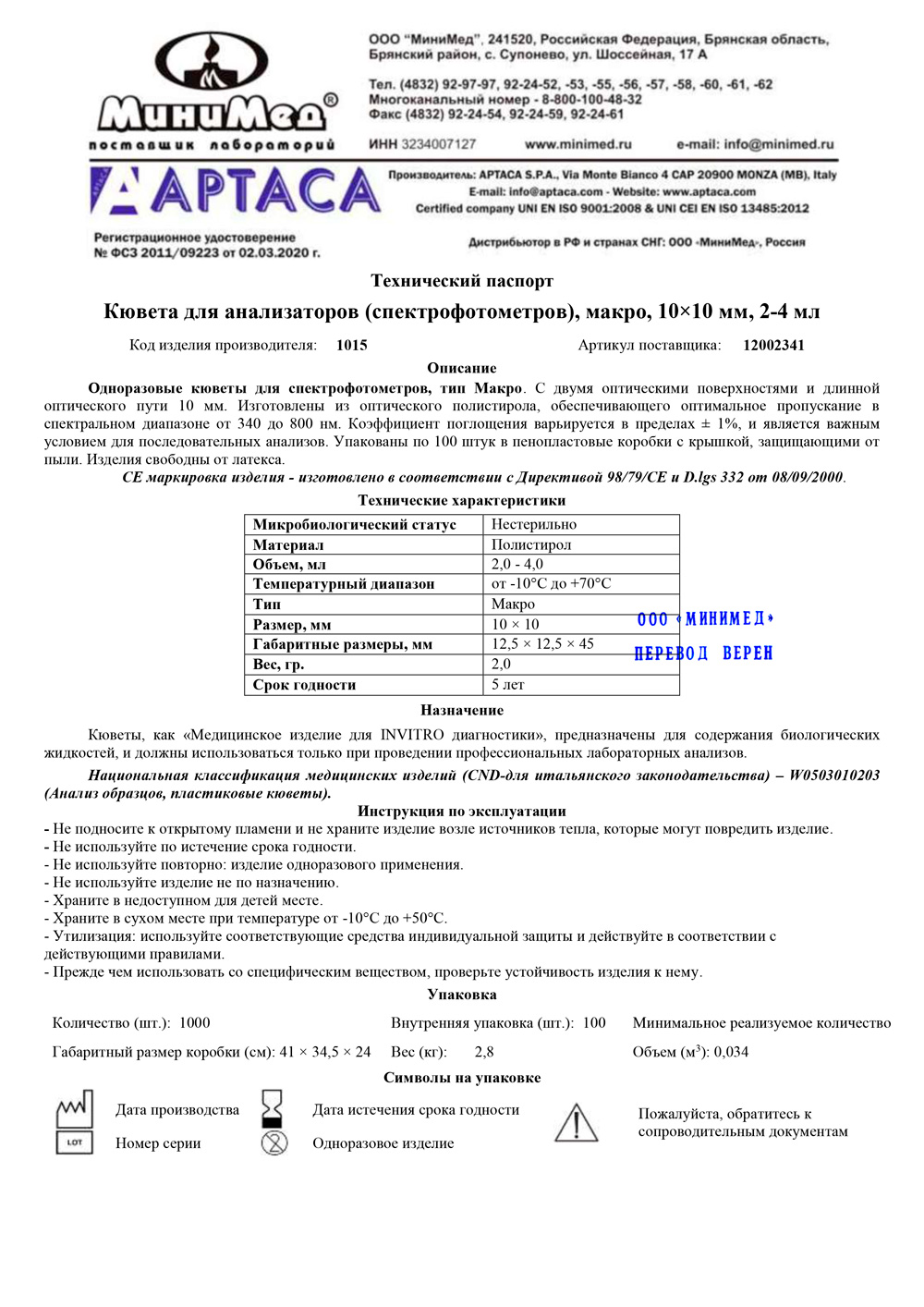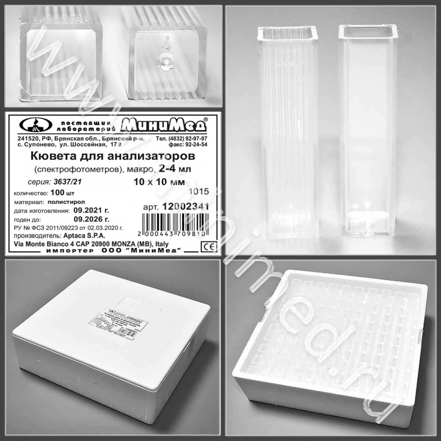 Кювета д/анализаторов(спектрофотометров),макро,п/с,10*10, 2-4 мл, уп.100/1000шт, Aptaca