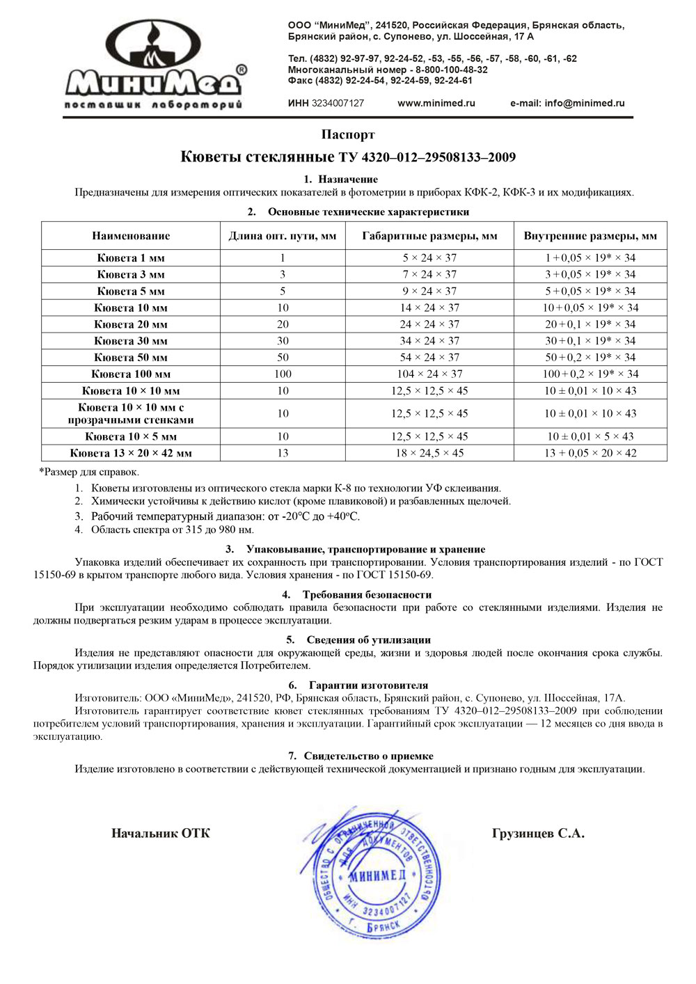 Кюветы для фотометрии изготовлены из оптического стекла марки К–8 по технологии УФ–склеивания. Химически устойчивы к действию кислот (кроме плавиковой кислоты) и разбавленных щелочей. Разработаны для приборов КФК–2, КФК–3 и их модификаций при работе в спектральном диапазоне от 315 до 980 нм.