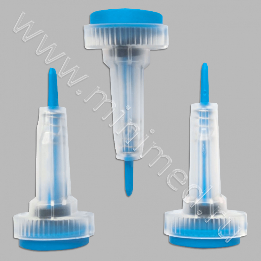 Ланцет заключен в пластиковый прозрачный чехол. Активация ланцета происходит при прикосновении к коже и нажатии на кнопку сверху ланцета. Цвет кнопки - голубой. Стерильность - гамма-лучи.