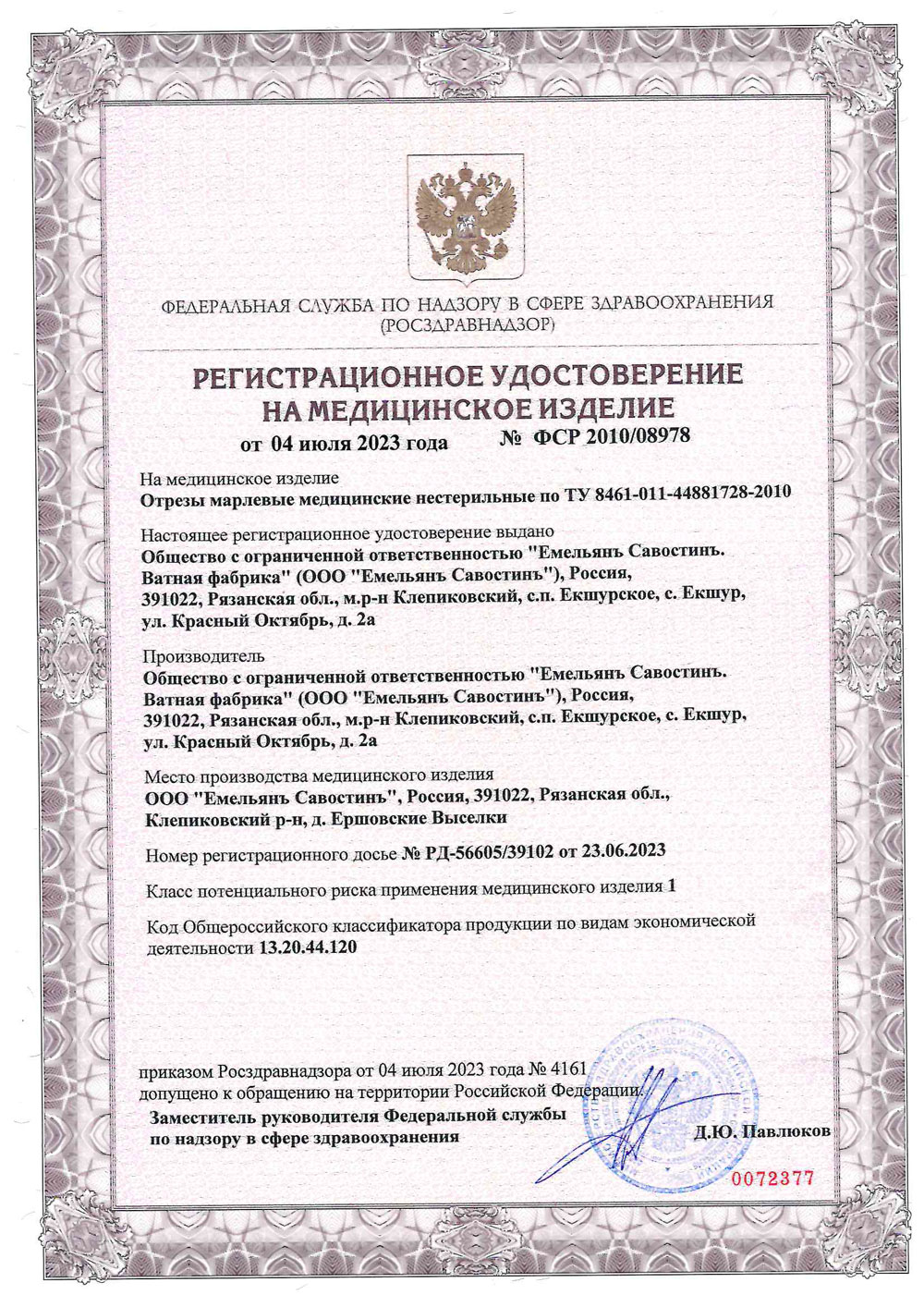 РУ № ФСР 2010/08978 от 04.07.2023 г.