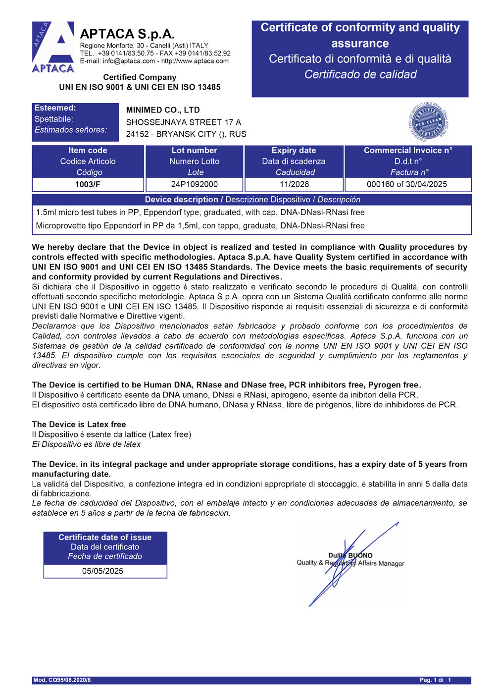 - Сертификат-1003-F. Микропробирка 1,5 мл, тип Эппендорф, с делениями. Лот 25P1024
