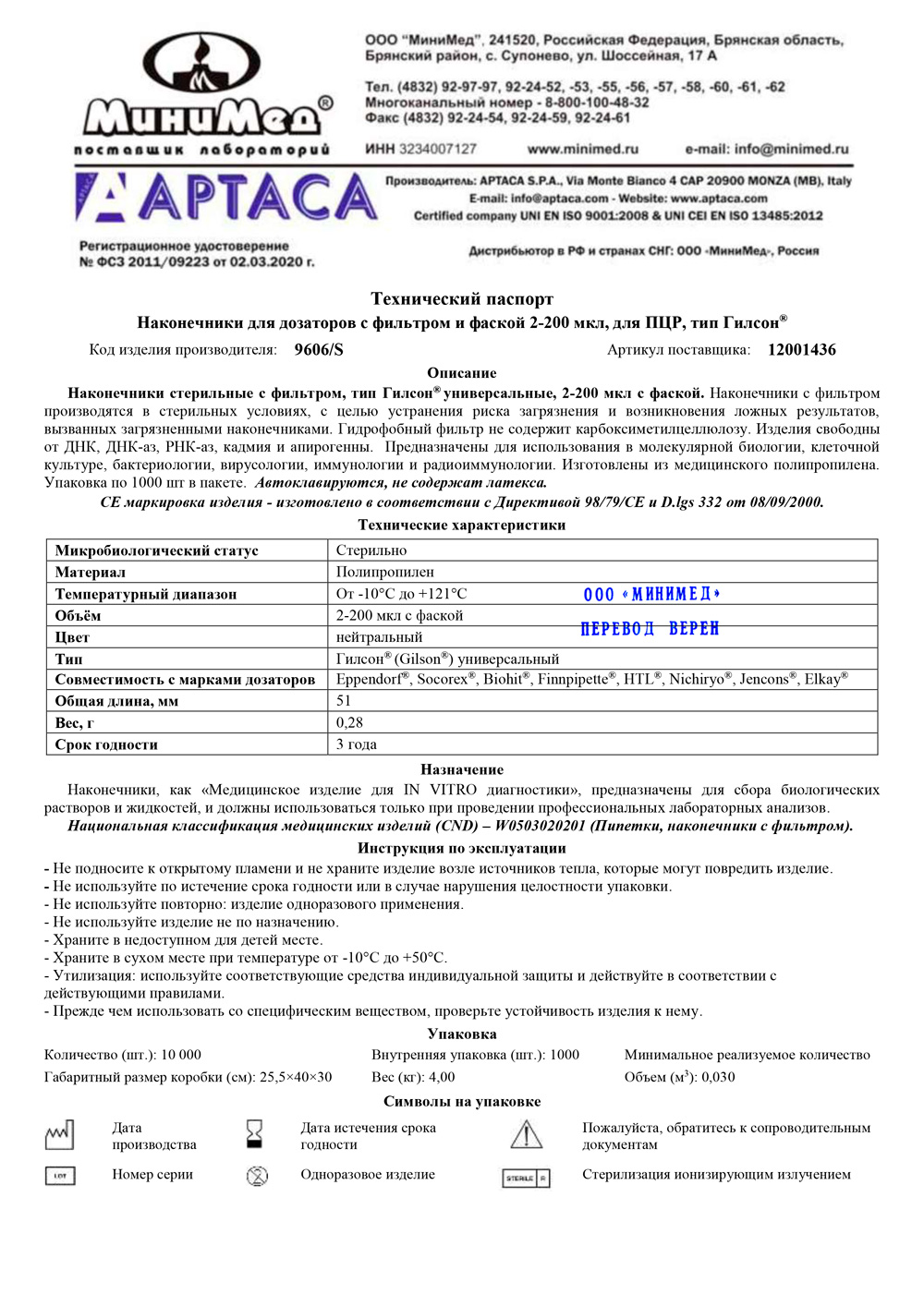 - Сертификат-9606-S. Наконечник для дозаторов с фильтром 2-200 мкл. Лот 5D1206Y до