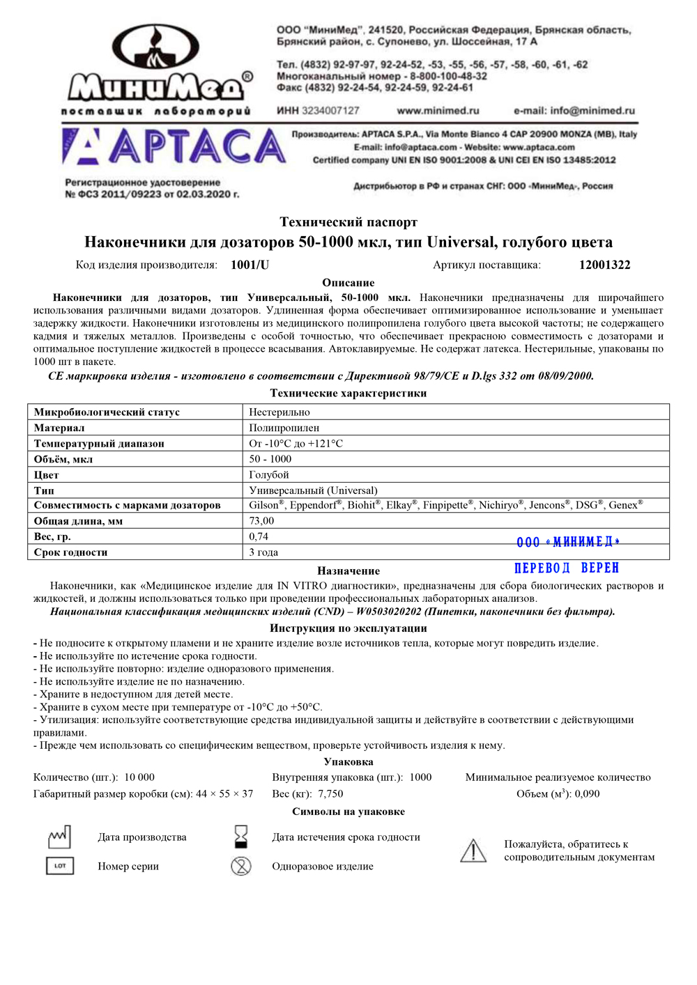 - Сертификат-1001-U. Наконечник для дозаторов 50-1000 мкл, Универсальный. Лот 4F06