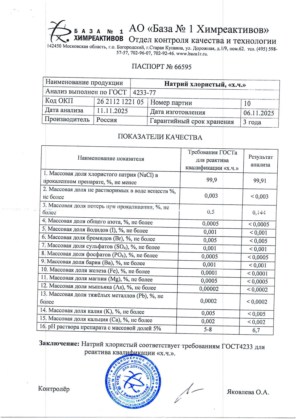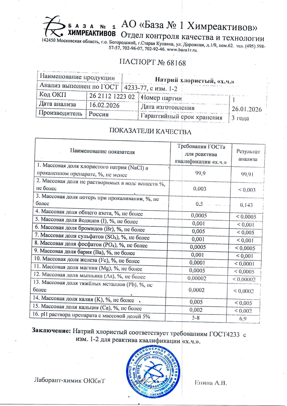 Натрий хлористый, хч, 1кг