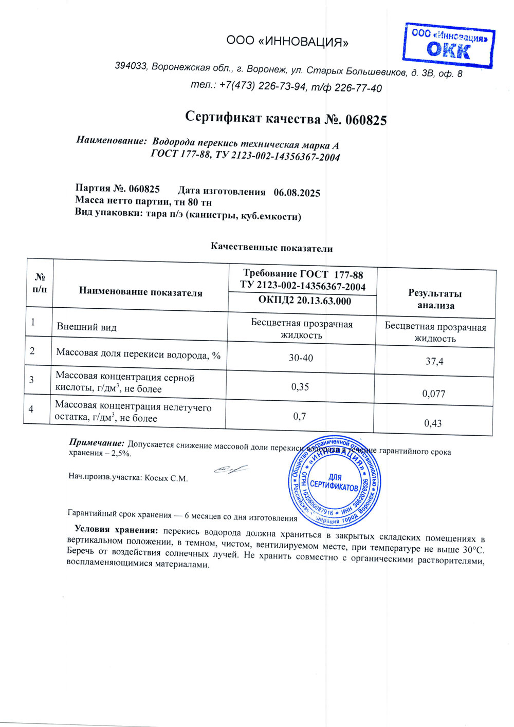 - Перекись водорода тех. марки А. Инновация. Сертификат до 18.06.2027