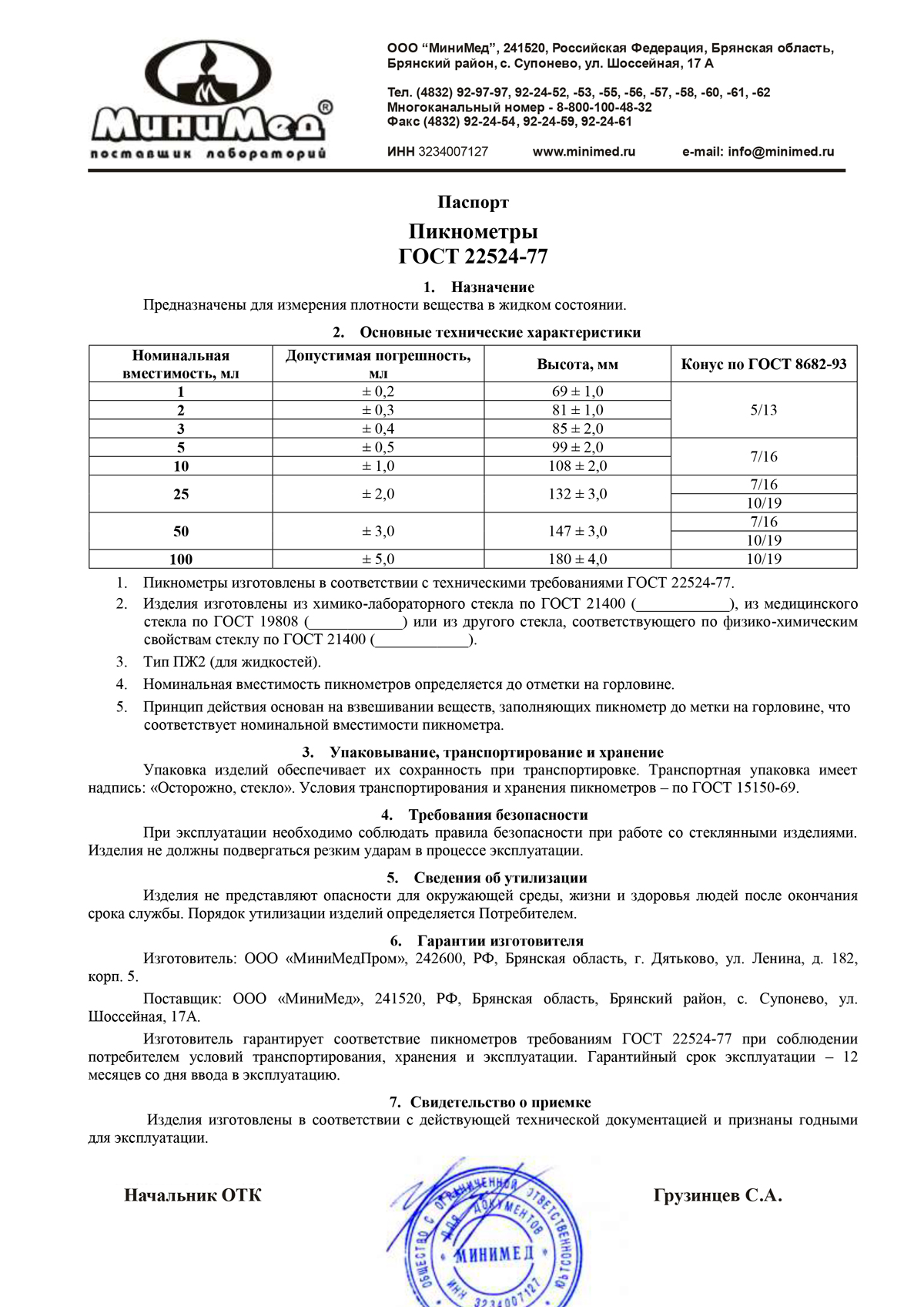 Пикнометр изготовлен в соответствии с требованиями ГОСТ 22524-77.