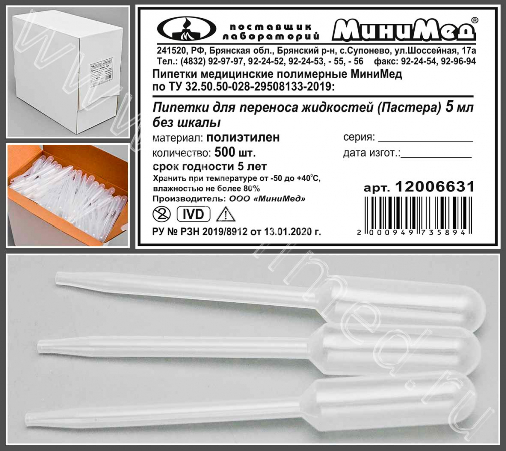 Пипетка для переноса жидкости (Пастера) 5 мл. н/стер, без шкалы, ТУ 32.50.50-028-29508133-2019, уп. 500шт, МиниМед