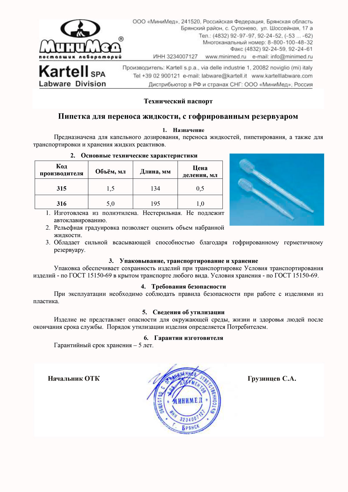 Пипетка для переноса жидкости 5 мл. н/стер, с гофрированным резервуаром, град, уп. 100 шт, Kartell