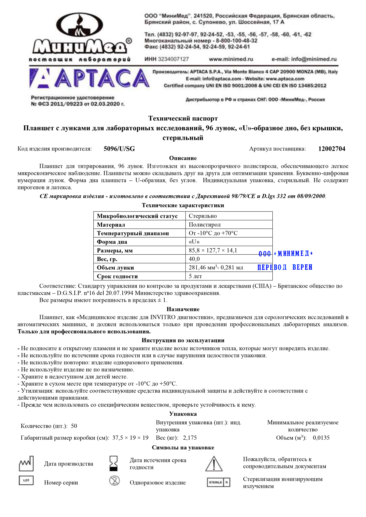 Упаковка ...................................................................................... инд/50 шт.